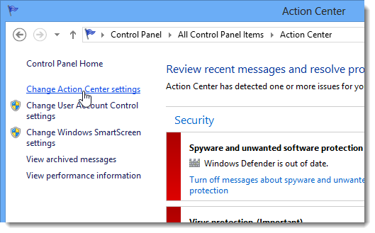 В то время как выполняются задачи обслуживания,также работают различные сообщения в области уведомлений в Action Center. Если вы не хотите видеть сообщения, или только хотите видеть сообщения для определенных задач по обслуживанию,нажмите кнопку Изменить в настройках Action Center, ссылку на левой стороне Действич в окне Action Center.