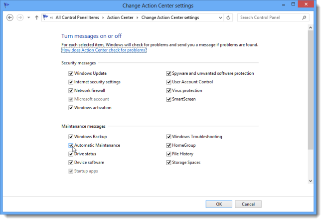 В режиме обслуживания,раздел Изменить настройки окна Action Center, все флажки для сообщений выбраны по умолчанию.Чтобы скрыть сообщения для определенных типов задач технического обслуживания, выберите нужные флажки в графах.Нажмите OK,чтобы принять изменения и вернуться в Action Center.