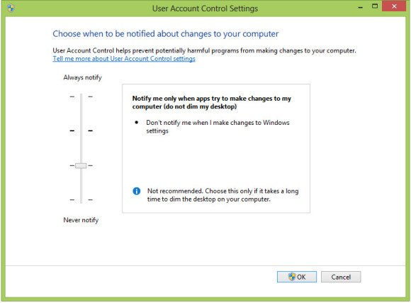 Чтобы сделать это,поместите курсор вашей мыши в любом верхнем или правом нижнем углу экрана и нажмите на значок Поиск.Затем в панели Поиска выделите Настройки и в поле поиска введите тип UAC . “Change User Account Control settings” появится в левой панели, щёлкните по ней, и откроется окно Настройки UAC. Просто перетащите ползунок вниз на один уровень,так что Windows 8 не будет гасить экран и будет только уведомлять вас,когда приложение,попытается внести изменения в систему.