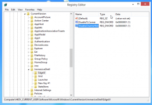 - DisableCharmsHint — Установите значение в 1, чтобы отключить Charms Bar, когда вы работаете с помощью мыши. Charms Bar не будет появляться при наведении указателя на правый верхний или нижний правый угол. Однако, как и написано выше, если вы переместите курсор в верхний правый угол, а затем переместите его вниз вдоль правого края экрана (или из правого нижнего угла до центра экрана по правому краю), он появляется снова.
