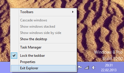 В Windows 8, Вам нужно нажать и удерживать сочетание клавиш на клавиатуре Ctrl+Shift и щёлкнуть правой кнопкой мыши на пустой области панели Задач. Тем самым, вы получите доступ к скрытому пункту контекстного меню: «Выход Explorer».