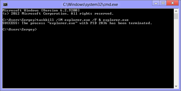 Это худший способ их всех,потому что он прекращает работу Explorer насильно. Каждый раз, когда вы используете taskkill, Explorer не будет сохранять свои параметры, например, расположение значков на рабочем Столе. Избегайте его использование,лучше используйе первые три указанных выше метода.