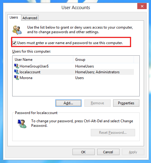 Проверьте опцию,называемую “Пользователи должны ввести имя пользователя и пароль, чтобы использовать этот компьютер”.