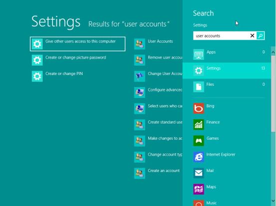 Шаг 3: Под окном поиска,на ближайшей странице поиска, выберите параметр Настройки,затем в поле поиска введите «Учетные записи пользователей». Опция User Accounts появится в левой стороне, выберите User Accounts.