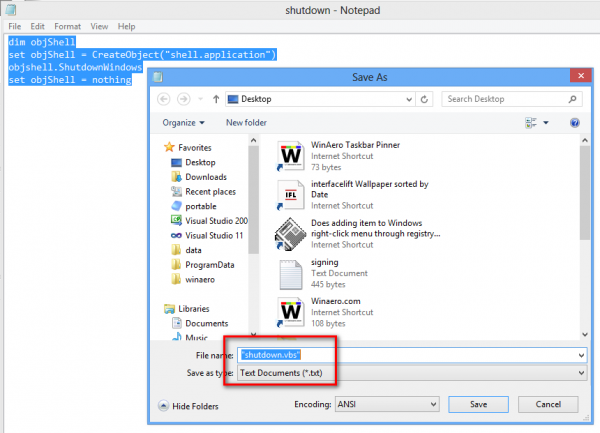 Совет: Вы можете добавить имя файла и расширение в кавычках, поому что Notepad не добавляет к имени файла, который вы ввели «TXT.». Добавьте его в кавычки и сохраните его как «shutdown.vbs», а не «shutdown.vbs.txt». Смотрим следующую картинку: