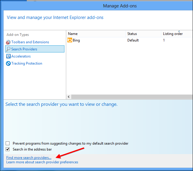 Выберите Поиск поставщиков, категории в окне Manage Add-ons  и нажмите кнопку Найти больше поставщиков услуг поиска в нижней части окна.