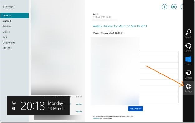 Шаг 2: После запуска, переместите указатель мыши в верхний или нижний правый угол экрана,чтобы увидеть панель Charms.Пользователи с сенсорным экраном на устройстве,могут провести от правого края экрана, чтобы открыть панель Charms. Нажмите на Параметры, чтобы увидеть Настройки Charms.