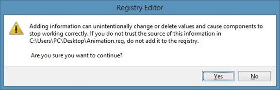 Шаг 2: Дважды щелкните на только что созданном файле Animation.reg , нажмите Да для учетных записей, а затем нажмите кнопку Да ещё раз, когда вы увидите «Вы уверены, что хотите продолжить».