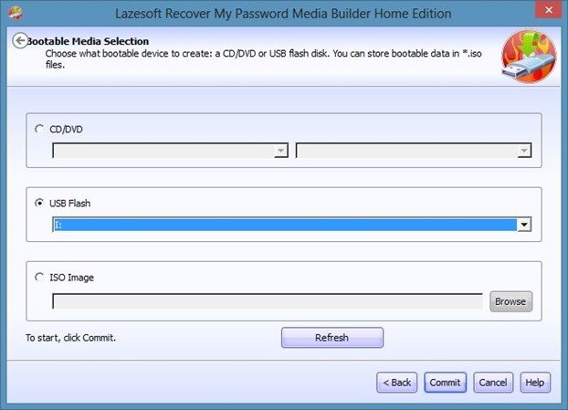 Шаг 4: Выберите ваш CD/DVD или USB флэш-накопитель, который вы хотите использовать как диск для восстановления, нажмите кнопку Commit. Если вы выбрали USB диск, в программе Recover My Password Home Edition, появится предупреждающее сообщение, заявляющее, что “Все данные на USB диске будут стерты. Вы хотите отформатировать USB диск?”. Если у вас есть какие-либо данные на USB, выполните быстрое резервное копирование,а затем нажмите кнопку Да.