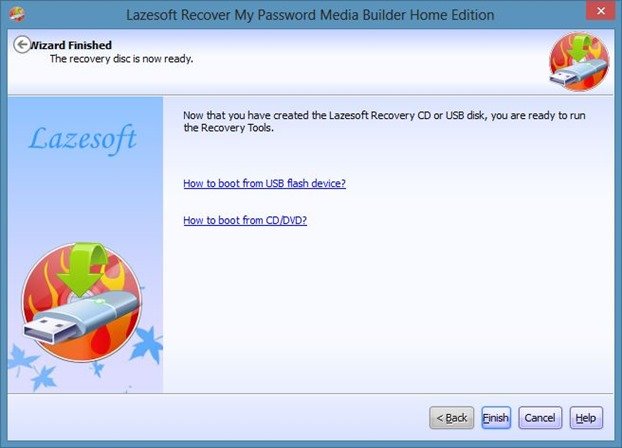 При создании загрузочного носителя для восстановления пароля может занять несколько минут.После того, как ваш recovery CD или USB готовы,вы увидите сообщение “Диск восстановления готов” . Нажмите кнопку » Finish » для выхода.