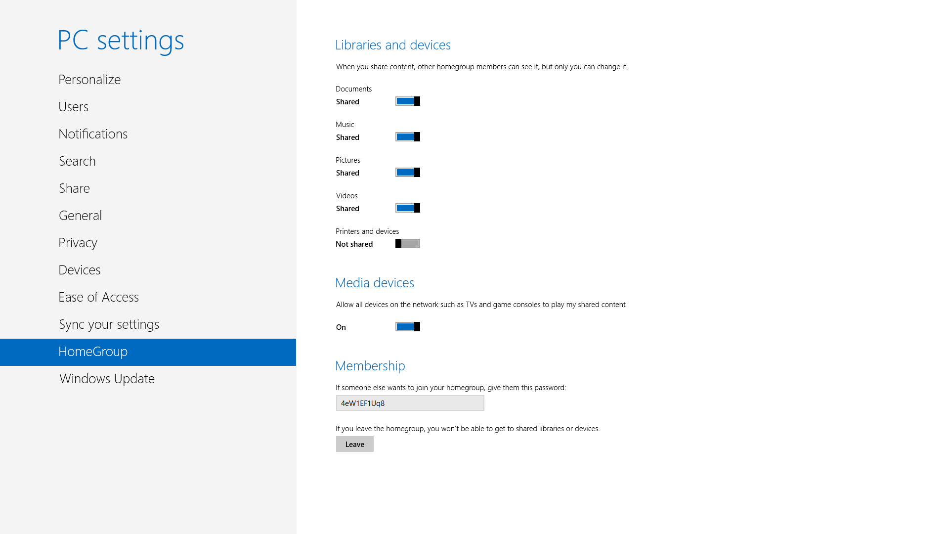 Windows 8 поддерживает HomeGroups,так что вы можете также подключить ПК с Windows Homegroup, если вы знаете пароль.Настройки Homegroup , в том числе ввод или изменение домашней группы и пароль, находятся в Настройки компьютера. Нажмите Windows-C и выберите Настройки, а затем выберите Изменение Настроек ПК и перейдите к  меню записи HomeGroup .
