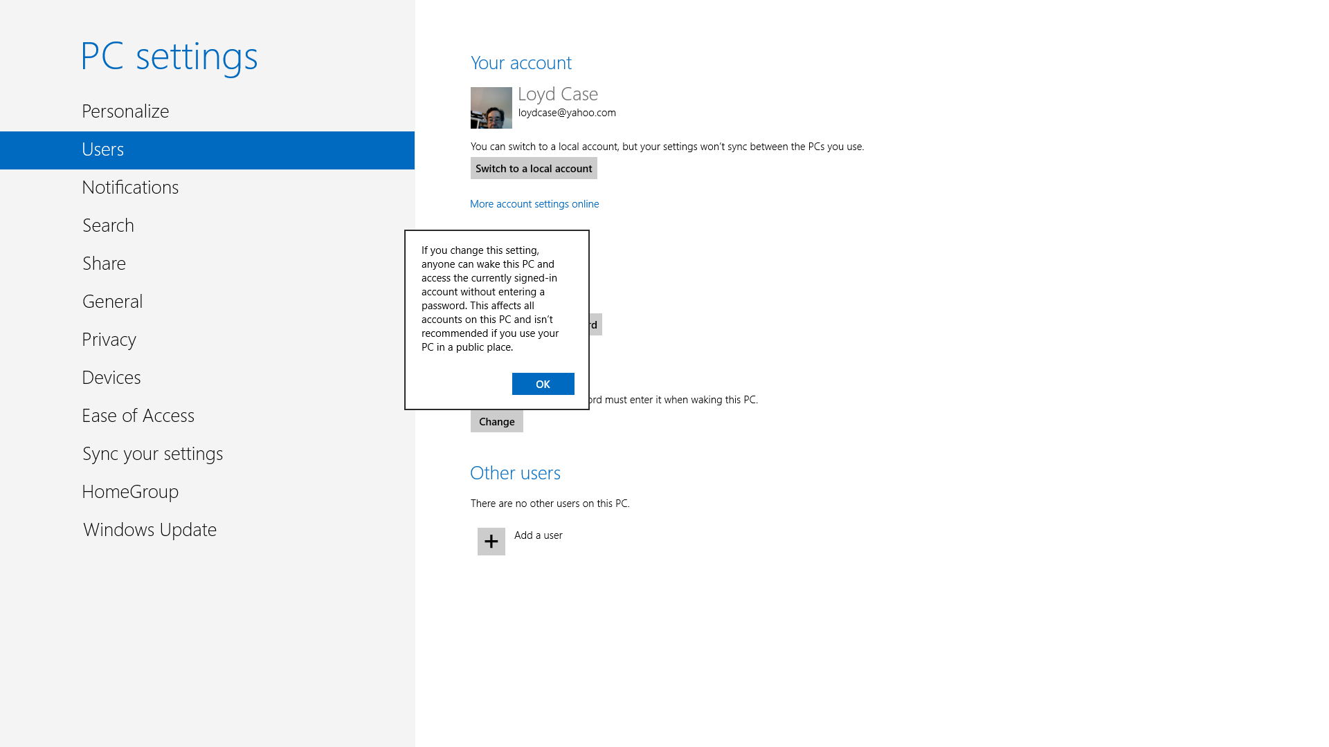 Примечание: Вы не должны быть подключены к Интернету для входа в систему на вашем компьютере, когда вы включите его-при условии, что вы используете аккаунт и login Microsoft.Вы даже можете отключить требование ввести пароль (вы можете это сделать в экране PC Settings Users ), но вы получите предупреждение, если вы сделаете это.