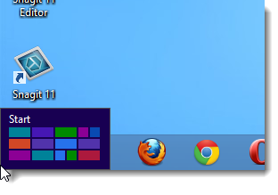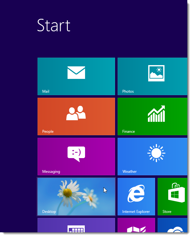 По умолчанию,Windows 8 автоматически устанавливает количество строк плитки,чтобы подогнать размер и разрешение вашего экрана,в зависимости от вашего монитора.Однако, вы можете указать Windows 8 отображать некоторые ряды плитки не всё время,несмотря на разрешение экрана.Для того чтобы это сделать, нужно внести  некоторые изменения в реестр.Если вы уже загрузились и находитесь на рабочем столе, щёлкните на рабочем столе на стартовом экране на плитку.