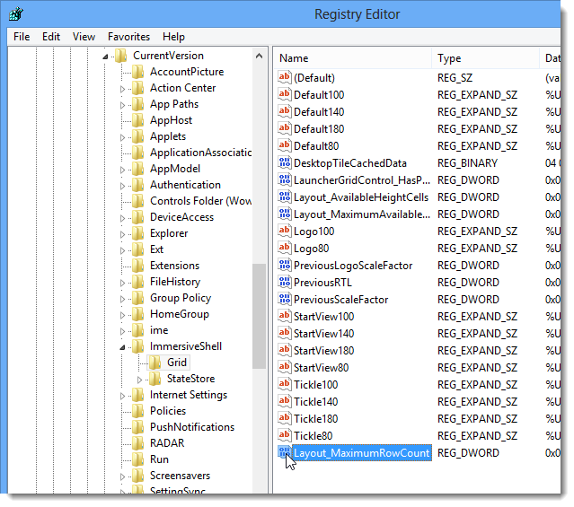 В левой панели перейдите на следующий ключ . HKEY_CURRENT_USERSoftwareMicrosoftWindowsCurrentVersionImmersiveShellMats В списке справа найдите значение Layout_MaximumRowCount.Его, скорее всего, не было. Если нет,в меню Edit выберите значение New|DWORD (32-бит) , чтобы создать новое значение.