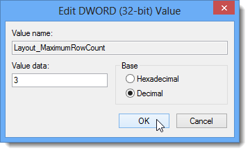 В диалоговом окне измените значение DWORD (32-бит),выберите десятичное,в качестве базы и введите нужное число строк в окне редактирования данных значения.Мы изменили значение на три. Максимальное количество строк пять. Нажмите кнопку OK.