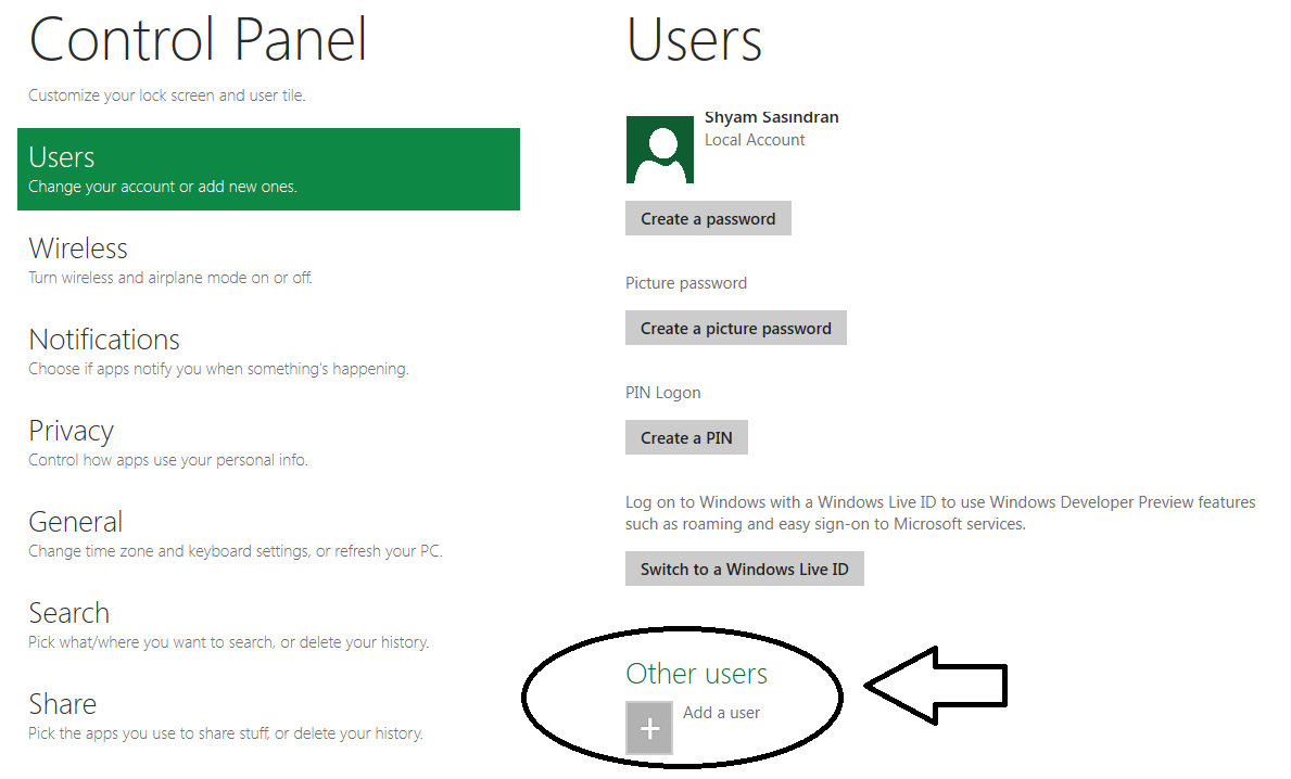 • Нажмите на панели управления и Highlight пользователей нажмите кнопку Другие пользователи (Добавить пользователя)