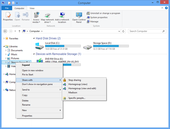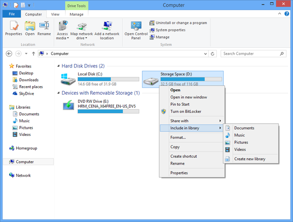 Для совместного использования Storage Spaces в HomeGroup вы будете иметь, чтобы добавить их в существующую разделяемую библиотеку или создать новую библиотеку и поделиться ими с вашей домашней группой.
