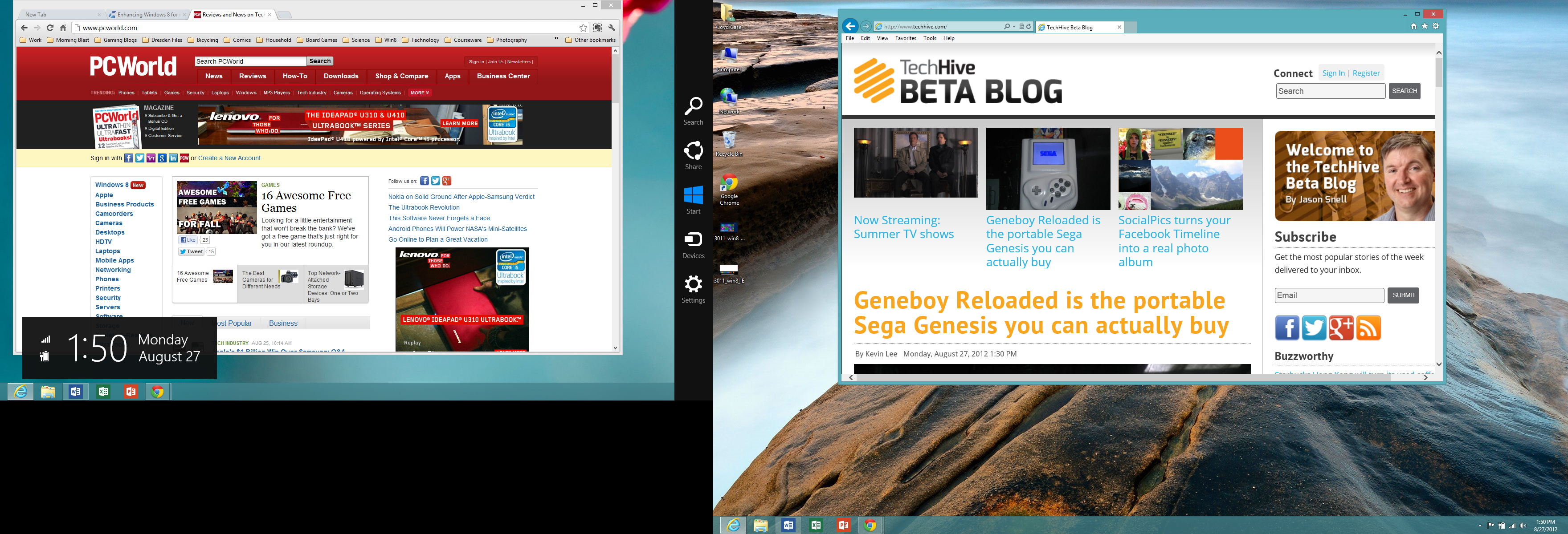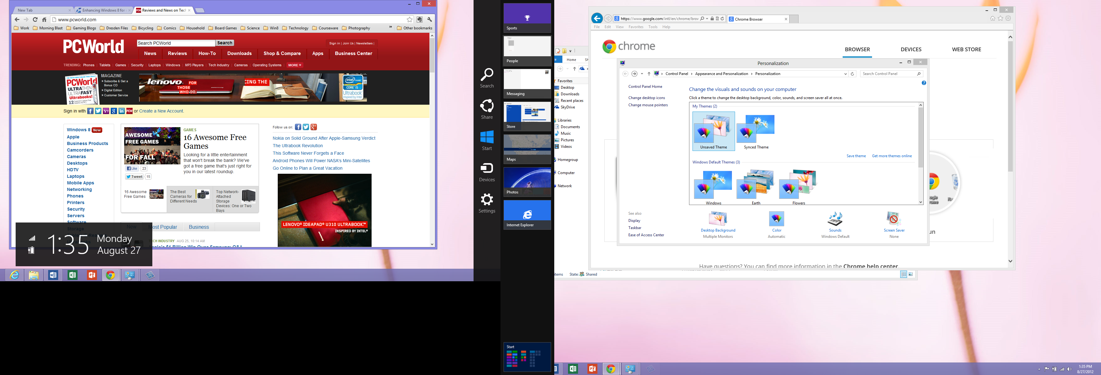 Но это не идеальный мир однако. Microsoft всё ещё пытается понять, как люди будут смешивать полный экран Windows 8-стилей приложений с настольными приложениями. В результате, в настоящее время, является то, что мы видим некоторые явные противоречия в мультимониторном поведении при использовании смеси Windows 8, полноэкранных приложений и традиционных настольных приложений.