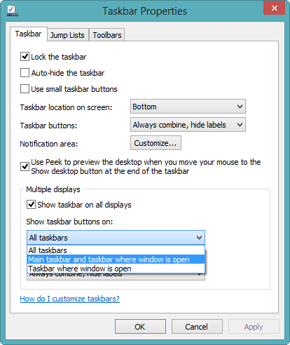 Windows 8 позволяет иметь отдельную панель задач на отдельных мониторах. По умолчанию используется, чтобы воспроизвести удержание значков на всех экранных панелях задач. Две других опции, которые вам доступы, нажав правой кнопкой мыши на панели задач и выбрав Свойства.Если вы предпочитаете метод Windows 7 , вы даже можете настроить панель задач так, чтобы она проявлялась только на основном мониторе.