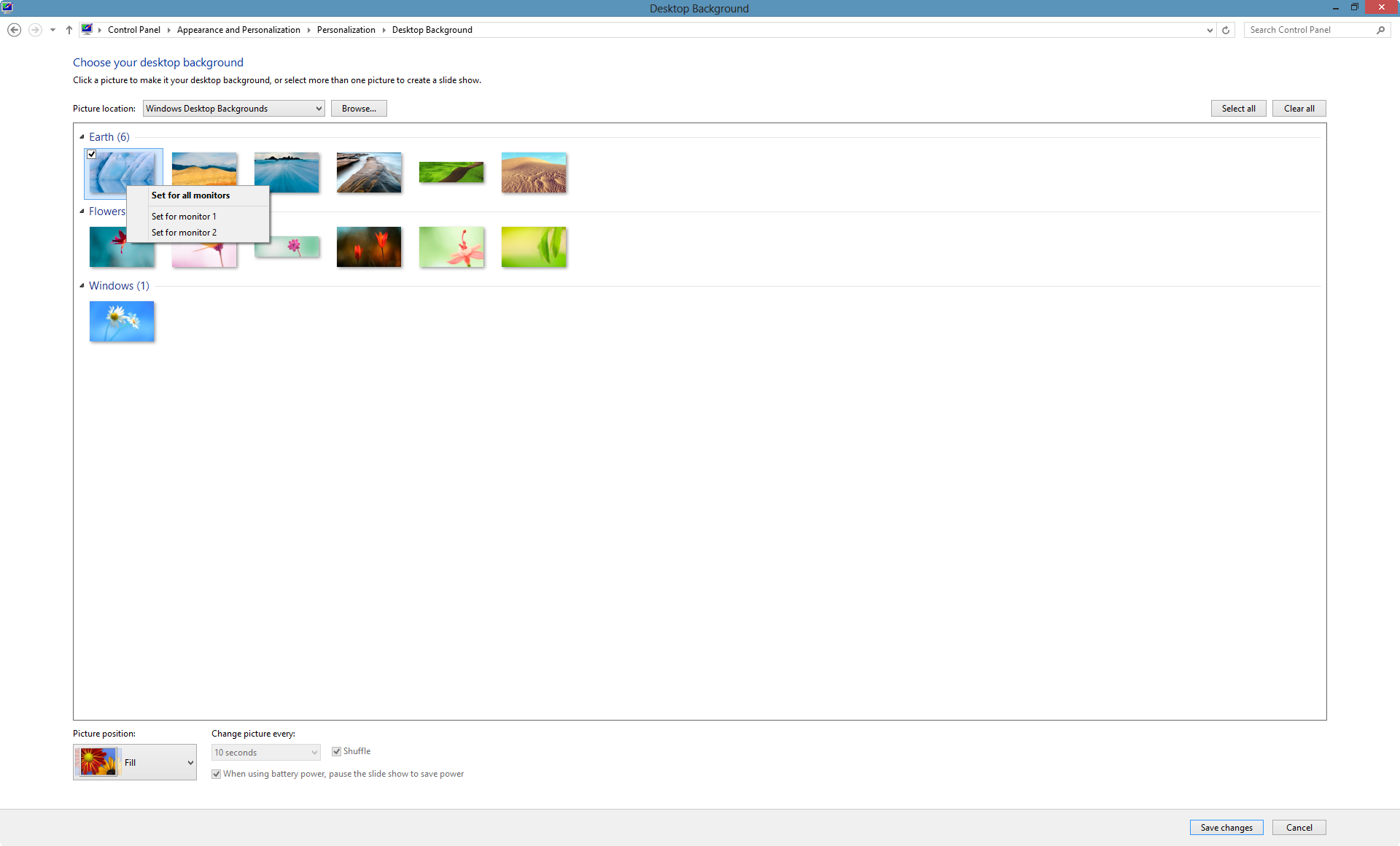 Теперь вы можете показывать различные фоновые изображения на разных экранах. В самом деле, если вы выберите несколько изображений, слайд-шоу будут показывать разное изображение на разных экранах. Windows 8 будет даже пытаться быть умной в том, что бы поддерживать пропорции и резолюции, чтобы показать, если вы используете несколько пропорций (скажем,вы просматриваете один портрет и один пейзаж).
